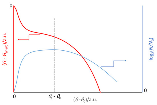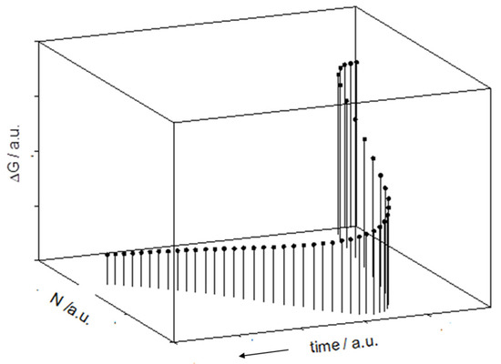 From an anthropic perspective, one can imagine that the generated cell gains a surplus of exergy, at the expenses of the generating cell. This view is consistent with the adopted model of the virtual culture that accounts for the age differences, the oldest cells being the first to die [21]. Age here stands for the duplication steps experienced and implies a loss of performance, namely, reduced exergy, in line with the findings of Ping Wang et al. [41], who claimed that “…death of E. coli is the result of accumulated damage”. This would occur at every duplication step during the growth phase. The neat ΔdG balance would be the same as that in Equation (1). As the cell enthalpy likely remains unchanged, δGc would concern just the entropy of the involved couple. A gain of exergy would correspond to a decrease in entropy and a larger reproductive efficiency.