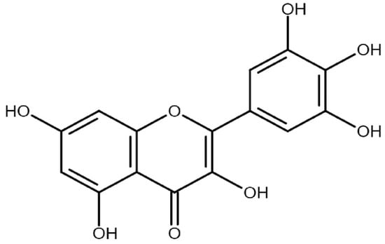 Myricetin (3,5,7,3′,4′,5′-hexahydroxyflavone), with the chemical formula C15H10O8, has a relative molecular mass of 318.24. It is a member of the class of flavonoids/plant-derived flavonoids known as flavonols. This flavonoid is usually found in nature within berries, fruits and vegetables, typically as glycosides instead of free aglycones []. Additionally, flavonoids are predominantly found in their glycoside form in a variety of sources such as nuts, vegetables, herbs, fruits, plants, and beverages like tea, fruit juices, wine, and medicinal plants [,,,,,,]. The amount present in various fruits and vegetables varies within different ranges. The quantities of myricetin in black fruits ranges between 14 and 142 mg/kg [], and in honey, it ranges from 29.2 to 289 μg/100 g honey []. A quantity of 57.2 mg/g of myricetin per gram was extracted from the fruits of Lycium barbarum L. [], while the skin of Carménère grapes contains 2.4 mg of myricetin per kg []. The concentration of myricetin in plants like Rosa canina L. (rose hip), Urtica dioica L. (nettle), and Portulaca oleracea L. (purslane) ranges from 3 to 58 mg/kg []. The estimated daily intake of myricetin is approximately 1.1 mg for males and around 0.98 mg for females []. The average daily consumption of myricetin is 2.2 ± 2.5 mg []. The average intake of myricetin for adults aged 18 to 64 years in the European Union is 2 mg per day, ranging between 1 and 4 mg per day []. The chemical structure of myricetin is shown in Figure 1.