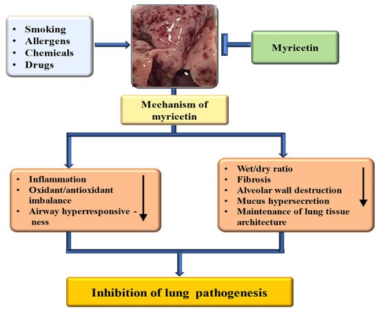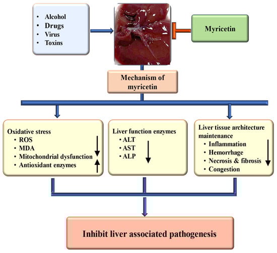 Liver diseases contribute significantly to global rates of illness and death []. Chronic liver diseases have become a substantial cause of death and morbidity over the last decade, leading to approximately two million deaths each year worldwide []. The primary contributors to chronic liver disease include non-alcoholic fatty liver disease, hepatitis B and C, cirrhosis, and hepatocellular carcinoma. These conditions, along with their complications, play a major role in liver-related mortality []. Various types of drugs, including synthetic drugs, are used to treat this pathogenesis. Unfortunately, such treatment leads to negative side effects. Various natural compounds and their bioactive constituents have been confirmed to show a hepatoprotective role by reducing oxidative stress and inflammation and maintaining liver tissue morphology [,,]. The role of myricetin in the inhibition of liver pathogenesis through modulation of different mechanisms is presented in Figure 2.