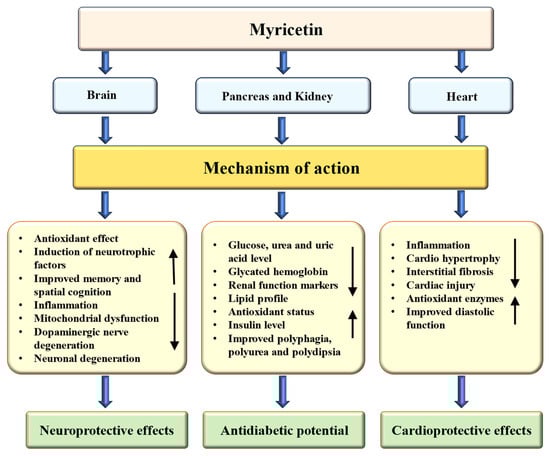 Anti-diabetic, neuroprotective and cardioprotective potential of myricetin through various mechanisms. The downward-pointing arrow shows downregulation, whereas the upward arrow represents upregulation.