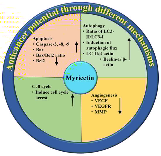 Cancer poses a severe threat to both physical and mental health, with high incidence and mortality rates globally [,]. Presently, the leading treatments for cancer consist of radiotherapy, chemotherapy, and surgical procedures. Despite their effectiveness, these approaches have limited efficacy and may also lead to negative side effects. Ongoing research and development efforts are focused on discovering new cytotoxic compounds from medicinal plants that exhibit antiproliferative activity [] and in vitro studies have shown the activities of flavonoids on tumor cells, such as the inhibition of cell growth and alteration of tumor invasive behavior []. Various medicinal plants and their bioactive compounds, including myricetin, demonstrate anti-cancer potential both in vivo and in vitro by modulating cell signaling pathways. Natural compounds and their bioactive compound role in cancer management have been established through their ability to target several molecules and signaling pathways, including those involved in angiogenesis, cell cycle, apoptosis, autophagy, tumor suppressor genes, and inflammation [,,]. Myricetin’s role as an anti-cancer through the modulation of different mechanisms is presented in Figure 4. Moreover, the role of myricetin in the management of cancer is summarized in Table 5. A study focused on ovarian cancer found that myricetin inhibited the secretion of the angiogenesis mediator vascular endothelial growth factor (VEGF) and reduced the levels of p-Akt and hypoxia-inducible factor-1α (HIF-1α) proteins in ovarian cancer cells. Additionally, an innovative pathway involving p21/HIF-1α/VEGF was involved in myricetin’s repressing effect on angiogenesis in cancer cells []. Another study based on both in vivo and in vitro experiments revealed that myricetin reduced vascular endothelial growth factor levels. Additionally, Western blot analysis indicated that myricetin downregulated the expression of p38MAPK and VEGFR2 [].