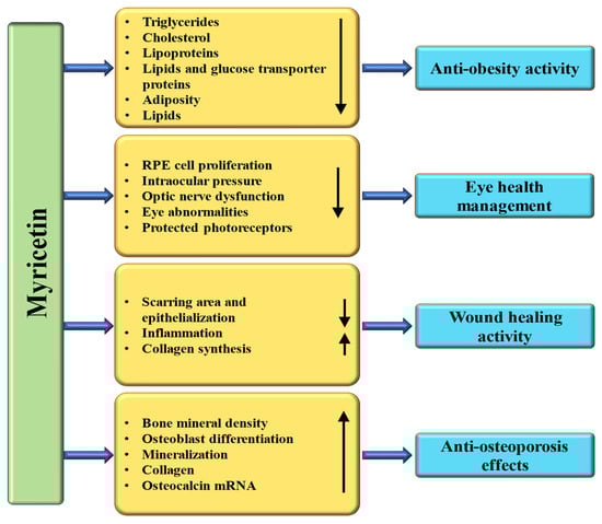Search engines such as PubMed, Scopus, Google Scholar, and Web of Science were used to collect data concerning myricetin and its role in pathogenesis management. The keywords used to collect data included sources, intake of myricetin, oxidative stress, inflammation, cardioprotective effects, neuroprotective potential, and role in the respiratory and reproductive systems. Its role is in anti-obesity, wound healing, anti-cancer, bone disease, and inhibition of microorganisms. Nanoformulation based on myricetin and synergistic effect with other compounds was searched. The literature that was comprised of experimental findings, randomized controlled trials, and epidemiological studies associated with myricetin was included in this study, whereas case reports, editorials, and thesis were excluded.