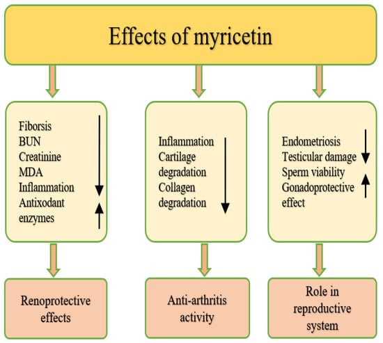 Natural compounds play a substantial role in preventing pathogenesis through its antioxidant potential as well as reducing the oxidative stress [,,]. Moreover, myricetin shows role in disease management through inhibition of oxidative stress related parameters. Supplementation of rat hepatocyte cultures with the myricetin directed to the formation of phenoxyl radical intermediates, as noticed in intact cells. These radicals corresponded to one-electron oxidation products of myricetin. The level of phenoxyl radicals was meaningfully decreased when myricetin-treated hepatocyte cultures were also supplemented with ferric iron nitrilotriacetate (Fe-NTA). This proposed that iron might accelerate the oxidation flux of myricetin. Furthermore, myricetin was found to be capable of preventing lipid peroxidation induced by iron in hepatocyte culture. Free malondialdehyde levels as well as the number of radicals derived from oxidized lipids were significantly decreased when myricetin was added to iron-treated cultures []. The antioxidant potential of myricetin on 5-fluorouracil (5-FU)-induced hepatotoxicity was examined. It was reported that the level of MDA was increased in those rats receiving the single intraperitoneal (IP)-dose of 5-FU as compared to the control group. Whereas those rats receiving the lower dose of myricetin alone caused an important reduction in MDA as compared to control group, that same difference does not appear amongst the higher dose of myricetin group. However, both groups of rats receiving both myricetin and 5-FU showed meaningfully reduced levels of MDA compared to 5-FU-only group. On the other hand, there was an important decrease in the hepatic tissue homogenate level of the superoxide dismutase (SOD) enzyme in the 5-FU-only group, whereas those rats receiving myricetin caused an important increase in SOD. The myricetin + 5-FU groups showed SOD levels that were meaningfully higher than those in the 5-FU-only group. Moreover, in the myricetin + 5-FU groups, a substantial increase in the levels of glutathione (GSH), as well as catalase (CAT), was noticed as compared to those in the 5-FU-only group [].