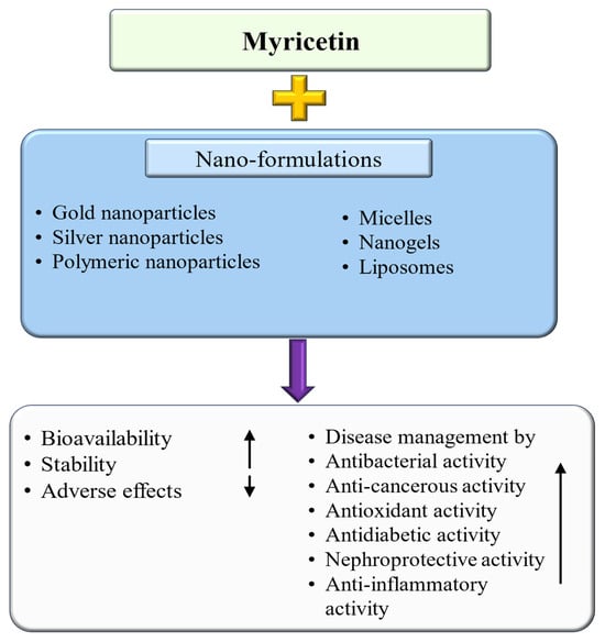 Myricetin’s role in cancer is described as myricetin activating ferroptosis in gastric cancer cells by enhancing malondialdehyde production and Fe2+ accumulation while suppressing glutathione levels. Moreover, in vivo experiments confirmed that myricetin treatment meaningfully inhibited the growth of subcutaneous tumors in BALB/c nude mice []. Its role as a hepatoprotective was noticed as myricetin prevented hepatotoxicity via modulating the ethanol metabolizing enzymes, production of free radicals, and inflammatory markers in vivo. Myricetin maintains oxidant–antioxidant status, lipid membrane integrity, and histoarchitecture. After ethanol administration, there was an increase in the aspartate aminotransferase (AST), aspartate transaminase (AST), malondialdehyde (MDA); myricetin administration reduced the level of all these markers. Additionally, treatment of myricetin decreased ethanol-induced inflammatory markers []. This review described the role of myricetin in pathogenesis and how it influences different biological activities. Additionally, it discusses the synergistic effects when combined with other compounds, as well as the potential impact of nanoformulations in various pathogenesis.