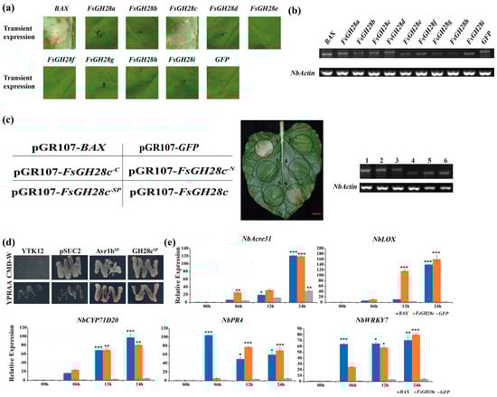 Furthermore, N. benthamiana leaves infiltrated with constructs expressing BAX, FsGH28c, and GFP were analyzed at 0, 6, 12, and 24 h post-infiltration (hpi) using RT-qPCR. The expression of pathogenesis-related marker genes NbAcre31 [], NbCYP71D20 [], NbLOX, NbPR4 [], and NbWRKY7 [] was significantly upregulated in response to FsGH28c treatment, as evidenced in Figure 1e. The expression levels of these genes were elevated in FsGH28c-infiltrated leaves compared to those infiltrated with GFP, indicating that FsGH28c activates immune responses in plants.