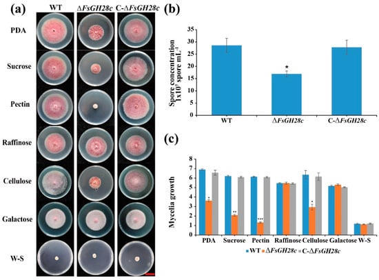 FsGH28c plays an important role in utilizing carbon source: (a) Phenotype analysis of the wild-type, ∆FsGH28c, and C-∆FsGH28c strains grown on PDA and Cazpek Dox medium with sucrose, galactose, pectin, raffinose, or cellulose as the sole carbon source for 7 days. Scale bar = 3 cm. (b) The spore concentration of the wild-type, ∆FsGH28c, and C-∆FsGH28c strains grown in liquid Czapek Dox medium for 3 days. Values represent means ± standard deviation of three replicates. The asterisks represent statistical differences performed by a t-test (* p < 0.05) in comparison with the wild-type strains. (c) The mycelial growth of the wild-type, ∆FsGH28c, and C-∆FsGH28c strains on Cazpek Dox medium at 7 days. Values represent means ± standard deviation of three replicates. The measurement unit represents centimeters. The asterisks represent statistical differences performed by a t-test (* p < 0.05, ** p < 0.01, *** p < 0.001) in comparison with the wild-type strains.