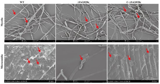 Observation of the mycelium and conidia on a scanning electron microscope: Mycelium of the wild-type, ∆FsGH28c, and C-∆FsGH28c strains grown on PDA medium for 5 days, and microconidia of the wild-type, ∆FsGH28c, and C-∆FsGH28c strains incubated in Cazpek Dox for 3 days were observed via scanning electron microscope, respectively. The red arrows point to the mycelium and microconidia of each strain. Scale bar = 20 μm.