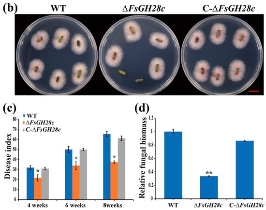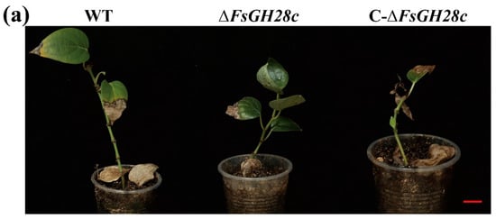 To investigate the role of FsGH28c in virulence, we generated knockout mutant strains ∆FsGH28c and complemented strains C-∆FsGH28c using the homologous recombination method as previous study (Figure S4a,b) []. Compared to the wild-type WN-1 (WT), the ∆FsGH28c strains showed reduced mycelial growth and conidia counts, and C-∆FsGH28c strains showed increased ability of mycelial growth and conidia production (Figure 2).