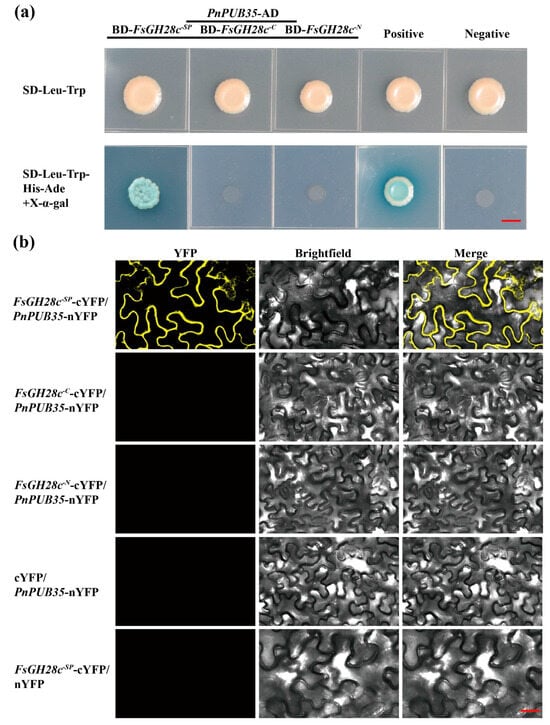 FsGH28c interacts with the PnPUB35: (a) The interaction between FsGH28c and PnPUB35 was confirmed by Yeast two-hybrid assays. FsGH28c-SP was an SP truncation mutation, FsGH28c-C was an N-terminal truncation mutation, and FsGH28c-N was a C-terminal truncation mutation. Scale bar = 0.3 cm. (b) BiFC assay showing that the interaction between PnPUB35-nYFP and FsGH28c-SP-cYFP formed a functional YFP in the plasma membrane. Scale bar = 100 µm.