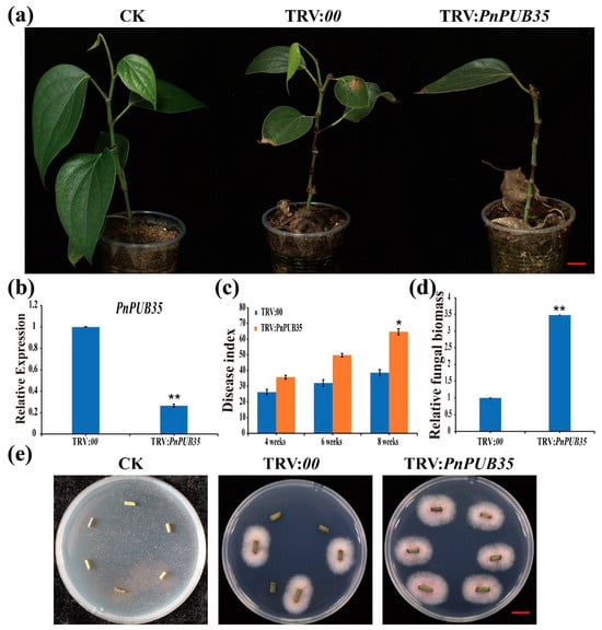 To further investigate the functions of PnPUB35, the VIGS method was utilized. The coding sequence (CDS) of PnPUB35, amplified from Piper nigrum cv. Reyin-1, was cloned into the tobacco rattle virus (TRV) vector pYL156, yielding the construct TRV: PnPUB35, following the methodology []. The TRV:00 construct served as the negative control. These TRV constructs were infiltrated into the leaves of black pepper seedlings, adhering to the protocol established []. To evaluate the silencing efficiency of PnPUB35, new leaves from both TRV: PnPUB35 and TRV:00 lines were examined. Plants in which PnPUB35 was successfully silenced underwent inoculation with the wild-type F. solani strain WN-1, consistent with procedures previously detailed []. Disease Index (DI), fungal recovery, and fungal biomass assays were conducted in accordance with the methods described by [] Liu et al.