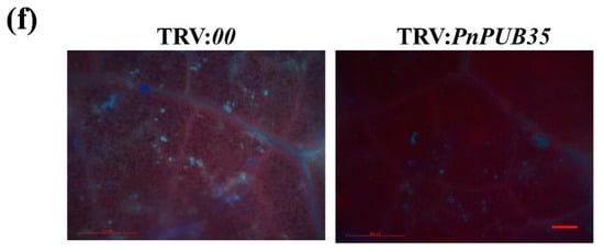 To further investigate the function of PnPUB35 in resistance to F. solani, black pepper plants were infiltrated with the VIGS constructs TRV: PnPUB35 and TRV:00. The silenced seedlings were infected with F. solani WN-1. The TRV: PnPUB35 plants showed more severe symptoms than the TRV:00 plants (Figure 6a). RT-PCR and qRT-PCR tested the gene-silencing efficiency of treatment plants. The results showed that PnPUB35 was successfully silenced (Figure 6b and Figure S8). The disease index (DI) of black pepper was investigated at 4, 6, and 8 weeks after inoculation. The results showed that the DI of PnPUB35-silenced plants infected by WN-1 strains was about 64.71. While the DI of TRV:00 plants was approximately 38.63 at eight weeks (Figure 6c). Fungal biomass assays in treatment plant roots were performed by qPCR. The results showed that the fungal biomass in PnPUB35-silenced plants was more than that in TRV:00 plants (Figure 6d). Fungal recovery and callose deposition assays showed that PnPUB35-silenced plants showed more susceptible to F. solani WN-1 than TRV:00 plants (Figure 6e,f).