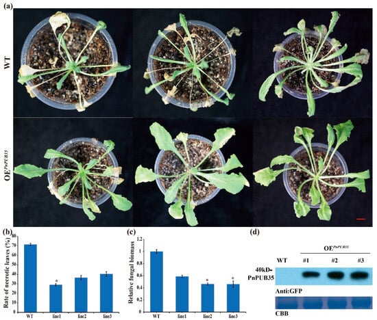 The CDS of PnPUB35 was subcloned into the plant binary vector pCAMBIA2300, driven by the CaMV 35S promoter. This recombinant construct was then introduced into A. tumefaciens strain GV3101. Transformants exhibiting positive integration were selected for the transformation of Arabidopsis using the floral dip method []. Screening of the progeny was conducted on Murashige and Skoog (MS) medium containing 50 mg L−1 of the selective agent. The T3 transgenic Arabidopsis lines were validated through PCR analysis and subsequently utilized in pathogenicity assays. The specific primers used in these experiments are listed in Table S1.