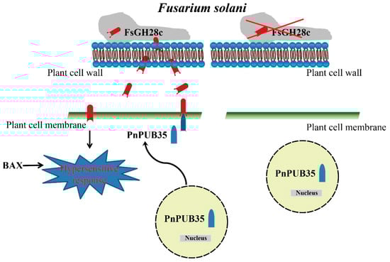 Schematic model of the interaction between FsGH28c and PnPUB35. When Fusarium solani infects plants, F. solani secretes a virulence factor FsGH28c. FsGH28c can induce immune responses. It is a positive regulator of F. solani virulence. The PnPUB35 transfers localization from the nucleus to the plant cell membrane in the presence of F. solani, and interacts with FsGH28c to protect the plant against F. solani. The red X represents the F. solani strain without FsGH28c.