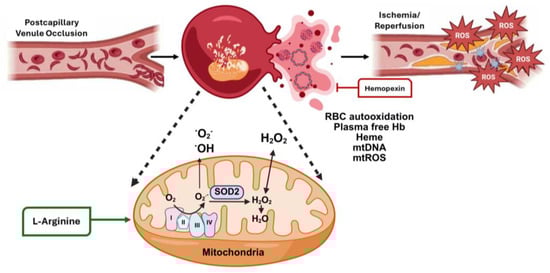 Consequences of chronic hemolysis and mitochondrial dysfunction in SCD. Hemoglobin S (HbS) polymerization leads to red blood cell (RBC) membrane damage and intravascular hemolysis releasing free Hb and heme in the plasma. Over time, the ability of haptoglobin and NRF2 to provide antioxidant protection from excess HbS, heme, and reactive oxygen species (ROS) is overwhelmed, leading to endothelial cell dysfunction, generation of ROS and vaso-occlusion in the post capillary venules under hypoxic conditions. This process eventually produces ischemia/reperfusion organ and tissue damage. Under normal conditions, mitochondria control the generation of ROS in cells, and they are removed by the process of autophagy during RBC maturation. However, chronic hemolysis in SCD leads to the retention of dysfunctional mitochondria that release free radicals (·OH, ·O2−), hydrogen peroxide (H2O2), mitochondrial DNA (mtDNA), and ROS (mtROS) to escalate oxidative stress further. Small molecules like hemopexin that directly bind and catabolize free heme and L-arginine reduce plasma heme levels and improve mitochondrial function, respectively. The figure was generated using BioRender (https://app.biorender.com/) accessed 15 April 2025.