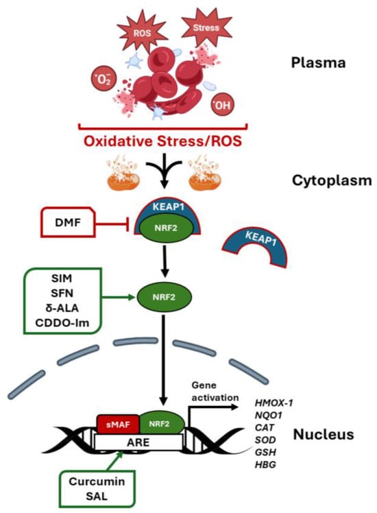 Our group also conducted studies in SCD mice treated with another NRF2 activator dimethyl fumarate (DMF), which inhibits cytoplasmic sequestration of NRF2 by KEAP1 leading to nuclear translocation and activation of its downstream target gene HMOX1, and NQO1 among others (Figure 2) []. DMF also reduces inflammation and organ failure and improves the SCD phenotype [,], supported by decreased proinflammatory cytokines, such as interleukin-6 and interleukin-1β, and heme, and oxidative stress levels. Moreover, our group showed that DMF induces HbF expression and reduced the percentage of sickle RBCs under hypoxia conditions []. On the contrary, in a SCD NRF2 knockout mouse, we showed that HMOX1 and HBG gene expression were silenced [], and disease severity increased significantly []. These findings support the rationale for activating NRF2 as a therapeutic approach to induce HbF expression, reduce oxidative stress, and improve organ function [].