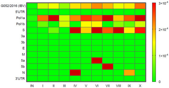 To assess the diversity of the viral populations, Shannon entropy was calculated separately for each IBV passage, including individual IBV genes as well as the entire genome. Entropy values were visualized using a heatmap (Figure 1). As indicated by the formula used (29), regions of the virus genome without variants resulted in Shannon entropy values of 0. Nevertheless, significant variations in entropy values throughout subsequent virus passages were also observed for the following genes: pol1a, pol1b, S, 5a, 5b, and N, and across the whole genome. The complexity of the IBV genome peaked in two passages, i.e., CP-VI and CP-X. The highest entropy values were observed in the pol1a gene (mean 2.29 × 10−4), with a peak at the CP-X (3.6 × 10−4). Moreover, high entropy was also noted in the S gene (mean 1.82 × 10−4), particularly in CP-IV, CP-VI, CP-VIII, and CP-X. For the pol1b and N genes, variations in entropy were also found, but these values were an order of magnitude lower (mean 6 × 10−5) compared to those in the pol1a and S genes. The highest entropy values in the 5a and 5b genes were recorded in CP-VI and CP-VII, respectively (Table S3).