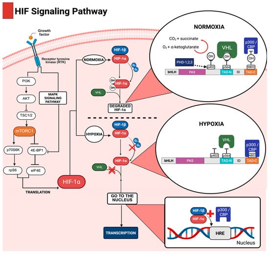 In addition to VHL-mediated post-translational control, HIF-1α expression and translation are regulated by intracellular signaling pathways such as the PI3K/AKT/mTOR pathway [62]. Activation of the mTORC1 complex enhances the translation of HIF-1α mRNA by phosphorylating proteins involved in translation initiation, including p70S6 kinase (p70S6K), eukaryotic translation initiation factor 4E (eIF4E), and 4E-binding protein 1 (4E-BP1) [58].