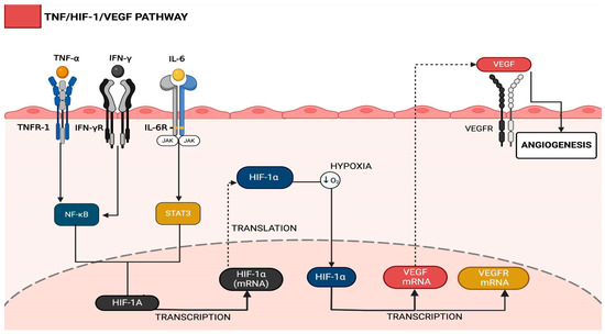 HIF-1α is an oxygen-sensitive transcription factor that regulates the expression of genes essential for cell survival in hypoxic conditions. Among the genes activated by HIF-1α, those involved in angiogenesis (VEGF), glycolic metabolism (SLC2A1 and PDK1), cell proliferation, and immune response stand out. In the systemic context, HIF-1α promotes metabolic adaptations, hemodynamic alterations, and tissue remodeling, which are crucial for tissue homeostasis in adverse conditions [14,15,16,17,18,19,20,21,22,23]. However, prolonged or dysregulated activation of HIF-1α during COVID-19 may contribute to chronic dysfunctions associated with PACS [14].