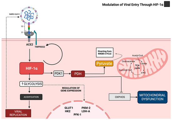 The infection attributed to SARS-CoV-2 triggers a complex series of cellular and molecular responses, particularly impacting hypoxia-related signaling pathways. HIF-1α has been identified as a crucial regulator in the pathophysiology of COVID-19 owing to its significant role in coordinating metabolic adaptation, inflammatory responses, and vascular remodeling under conditions of low oxygen tension. Severe cases of COVID-19 are commonly distinguished by hypoxemia and substantial endothelial dysfunction, conditions that are closely linked to the activation of HIF-1α. Additionally, recent studies suggest that viral non-structural proteins (NSPs) could directly interfere with oxygen-sensing mechanisms through the inhibition of prolyl hydroxylase domain proteins (PHDs) and the von Hippel–Lindau (VHL)-mediated proteasomal degradation of HIF-1α, consequently extending its transcriptional activity [31,35,63,64,65].