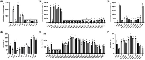 Rosa rugosa root extract fractions from liquid–liquid fractionation, silica-gel open column chromatography, and preparatory thin-layer chromatography (TLC) protected rat pheochromocytoma against H2O2-induced cytotoxicity: Cell viability and intracellular oxidative stress assessments. (A–C) Intracellular oxidative stress levels were measured using samples from liquid–liquid fractionation, silica-gel open column chromatography, and TLC, (D–F) Cell viability was measured to examine protective potential of samples from liquid–liquid fractionation, silica-gel open column chromatography, and TLC against oxidative stress. H1–H3: n-hexane fractions; C1–C3: chloroform fractions; EA1–EA3: ethyl acetate fractions; EA2: ethyl acetate fraction #2 selected for further purification; TLC bands 1–9: subfractions separated from EA2 based on Rf value. Normality was assessed using the Shapiro–Wilk test, and the significance was evaluated using one-way ANOVA followed by Dunnett’s post hoc test. Results are shown as means ± standard deviations (n = 4). Different superscripts indicate significant differences among groups at p < 0.05. Abbreviations: NEG, untreated group; POS, hydrogen peroxide (200 μM) treated group; REF, vitamin C (100 μM) treated group; RR root, Rosa rugosa root; TLC, thin-layer chromatography.