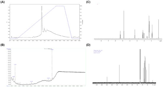 Oleamide from Rosa rugosa root extract was chemically characterized using high-performance liquid chromatography (HPLC), gas chromatography–mass spectrometry (GC-MS), and nuclear magnetic resonance (NMR) spectroscopy. (A) A representative chromatogram of HPLC for separation of oleamide from R. rugosa root extract (retention time of 42 min). The black line represents the compound peaks, while the blue line indicates the mobile phase gradient; (B) A representative GC-MS chromatogram of oleamide (retention time of 24.8 min); (C) 13C-NMR spectrum; (D) 1H-NMR spectrum.