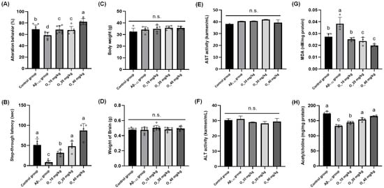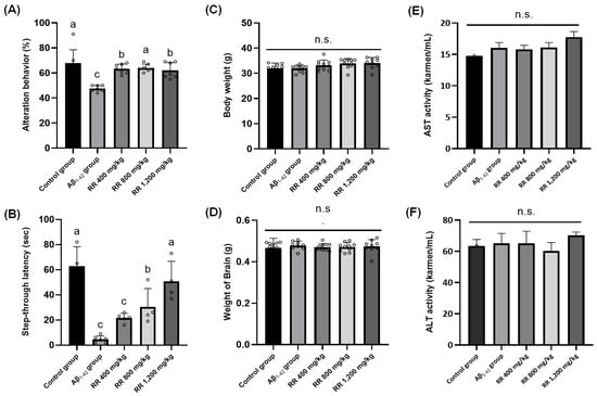 Rosa rugosa root extract exhibited neuroprotective effects in an Aβ1-42-induced mouse model of cognitive impairment: Y-maze and passive avoidance tests. (A) Y-maze test; (B) Passive avoidance test; (C,D) Body and brain weights of mice; (E,F) AST and ALT activity in the serum of Institute of Cancer Research mice. Control group was injected with Aβ42-1, a reverse-sequence peptide of Aβ1-42, commonly used as a non-toxic negative control. Aβ1-42 group was injected with 410 pmol of Aβ1-42 per mouse. Sample groups (RR 400, RR 800, and RR 1200) were injected with 410 pmol of Aβ1-42 after being supplemented with extract RR (400 mg/kg, 800 mg/kg, and 1200 mg/kg per day). Normality was assessed using Shapiro–Wilk test, and significance was evaluated using one-way ANOVA followed by Dunnett’s post hoc test. Results are shown as means ± standard deviations (n = 7–8). Different superscripts indicate significant differences among groups at p < 0.05. Abbreviations: ALT, alanine aminotransferase; AST, aspartate aminotransferase; n.s., not significant; RR, Rosa rugosa root.