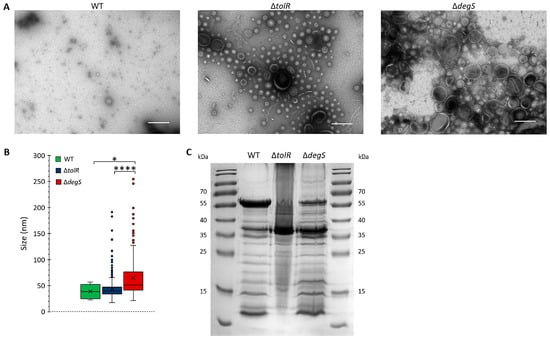 Transmission electron microscopy (TEM) was used to assess the impact of tolR and degS deletions on OMV morphology (Figure 1A). The OMVs produced by the S. Typhi WT strain exhibited a sparse distribution, with vesicles displaying uniform, spherical shapes, and a consistent size range, indicative of tightly regulated vesiculation that maintains outer membrane stability under physiological conditions. In contrast, the ∆tolR mutant showed a significant increase in OMV density, with a broader size distribution, while maintaining a generally spherical morphology. The observed hypervesiculation aligns with the role of the Tol-Pal system in preserving outer membrane integrity; its disruption promotes compensatory vesicle release in response to membrane instability [,,,,]. The ∆degS mutant exhibited the most pronounced vesiculation phenotype, characterized by a substantial increase in vesicle production and marked size heterogeneity. These vesicles were significantly larger and displayed greater structural variability than those derived from the WT and ∆tolR strains. The absence of DegS, a key regulator of the σE stress response, likely intensifies envelope stress, leading to excessive and dysregulated OMV production [,,].