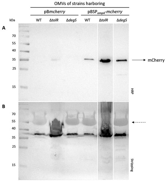 Figure 2 and Figure 3 collectively demonstrate that SPompA is pivotal for directing mCherry into OMVs. The Western blots in Figure 2 show that cytoplasmic mCherry alone (pBmcherry) barely appears in ∆tolR OMVs and is undetectable in WT or ∆degS OMVs. The presence of cytoplasmic mCherry in ∆tolR OMV preparations is likely due to the presence of outer–inner membrane vesicles (OIMVs) and multilamellar vesicles (MVs), which can incorporate cytoplasmic proteins since it has been described that tol mutants are prone to produce this kind of vesicles [,]. In contrast, all the strains exhibit strong mCherry bands when SPompA is employed (pBSPompA-mcherry). It is important to note that different vesicle numbers (i.e., OMVs but also OIMVs and MVs) with inhomogeneous mCherry content were probably loaded on the gels, especially for the ΔtolR mutant; thereby, hypervesiculation increases the total number of mCherry OMVs, as corroborated by cytometry. Although the ∆tolR mutant consistently shows the highest fluorescence in the OMV fraction (likely resulting from a combination of OIMVs, hypervesiculation, and SPompA-mediated targeting), the ∆degS mutant also benefits significantly from the signal peptide, demonstrating that different hypervesiculation pathways can be exploited to effectively enhance heterologous protein incorporation into OMVs and ultimately optimize OMV-based delivery systems.