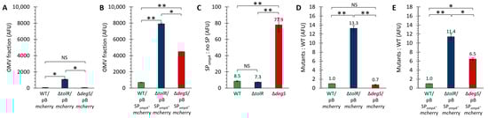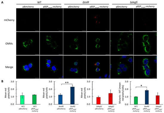 Figure 3A shows the fluorescence intensity (arbitrary fluorescence units, AFUs) measured in the OMV fractions of the strains transformed with the plasmid pBmcherry. No significant fluorescence signal was detected for the WT strain, indicating that cytoplasmic mCherry is not efficiently incorporated into OMVs without a targeting mechanism. Similarly, the ∆degS mutant exhibited negligible fluorescence levels, suggesting that the absence of DegS does not lead to cytoplasmic mCherry leakage into OMVs. In contrast, the OMVs derived from the ∆tolR mutant displayed a significantly higher measurable fluorescence signal than the WT and ∆degS strains. These results align with the Western blot findings, where only the ∆tolR mutant showed a faint mCherry signal in the OMVs.