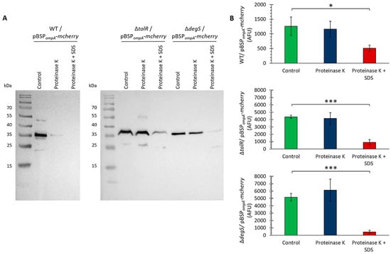 To determine whether mCherry localizes within the lumen of OMVs, where it would be protected from external factors, we performed a proteinase K protection assay [,]. This assay distinguishes between proteins exposed on the OMV surface, which are susceptible to protease digestion, and luminal proteins, which remain protected unless the membrane is disrupted. The OMVs from the S. Typhi WT, ∆tolR, and ∆degS strains carrying the pBSPompA-mcherry plasmid were treated with proteinase K, either in the presence or absence of SDS, and mCherry detection was assessed by Western blotting and fluorescence measurements. This approach allowed us to evaluate the spatial localization of mCherry within the OMVs and determine whether SPompA facilitates its incorporation into the protected lumen.