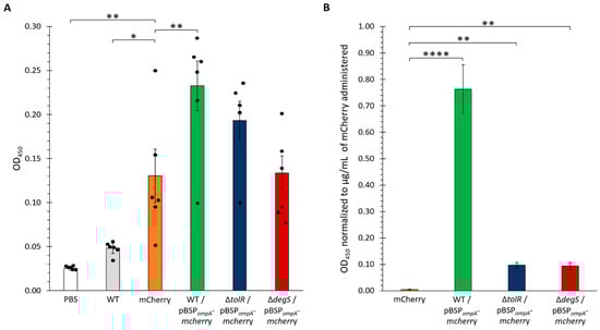 To evaluate the immunogenic potential of OMVs loaded with mCherry, six groups of BALB/c mice were immunized with different formulations, including OMVs from S. Typhi WT, OMVs from hypervesiculating mutants (∆tolR and ∆degS), and purified mCherry protein as a positive control. In these experiments, only mCherry alone was adjuvanted with ImjectTM Alum (Thermo Scientific, Waltham, MA, USA). Serum samples were collected two weeks post-booster immunization, and the levels of mCherry-specific IgG antibodies were quantified by ELISA (Figure 7A).