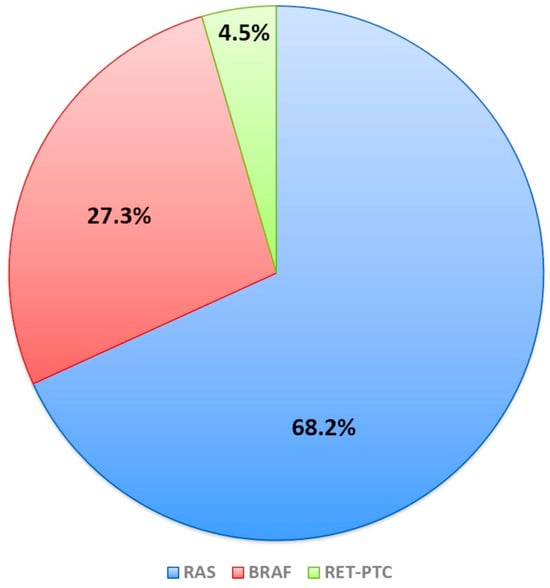 The presence of pathological/likely pathological mutations by NGS testing was found in 22/105 (21%) FNAC samples. Considering only the 22 mutated nodules, RAS genes point mutations (2 HRAS, 2 KRAS, and 11 NRAS) were present in 15 of 22 (68.2%), BRAF point mutations in 6 (27.3%), and RET/PTC rearrangements in 1 of 22 (4.5%) mutated samples (Figure 1).