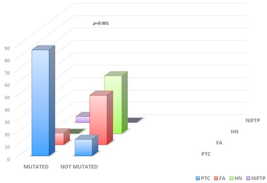 Notably, in our series, RAS-like mutations showed a good overall specificity and PPV, especially among high-risk indeterminate lesions. These findings are in line with other reports in which the presence of RAS mutation was strongly suggestive of malignancy or lesions deserving surgery [,,]. On the other hand, some authors have shown that RAS-mutant nodules with indeterminate cytology are clinically low risk and might be followed with active surveillance []. While it is generally accepted that the finding of an RAS mutation increases the preoperative risk of malignancy, the clinical management of RAS-mutant nodules with indeterminate cytology remains a highly debated topic [,].