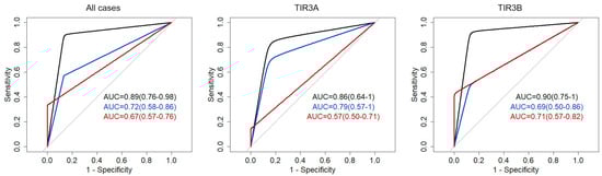 Diagnostic performance of the 17-gene NGS panel. ROC curves were built for all cases (left), TIR3A cases only (center), and TIR3B cases only (right). In each panel, AUC of all mutations (black), RAS-like mutations (blue), and BRAF-like mutations (red) are shown.