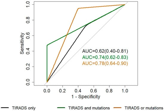 Diagnostic performance of EU-TIRADS risk class alone (EU-TIRADS 2–3 vs. 4–5, black) and combined with molecular test. In detail, in green is the ROC curve considering as a predictor of malignancy both EU-TIRADS 4–5 and the presence of mutations; in orange is the ROC curve considering as a predictor of malignancy EU-TIRADS 4–5 or the presence of mutations.