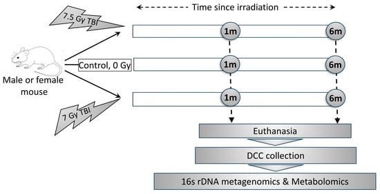 Outline of the research strategy. Mice were exposed to 7 Gy and 7.5 Gy total body irradiation (TBI), and their descending colon contents (DCCs) were collected at 1 month (1 m) and 6 months (6 m) post-TBI. In parallel, non-irradiated control’s DCCs were collected with age-matched 1 m and 6 m time periods. All DCC collection was conducted post-euthanasia.