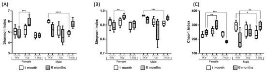 The box and whisker plots in Figure 2A–C depict sex-specific longitudinal trends in alpha diversity. In females, at 6 months post-TBI, the alpha diversity was significantly increased in the 7 Gy TBI cohort, but it was reduced in the 7.5 Gy TBI cohort. In the male cohort, a significant reduction in alpha diversity was noted 1 m post-radiation for both doses of radiation.
