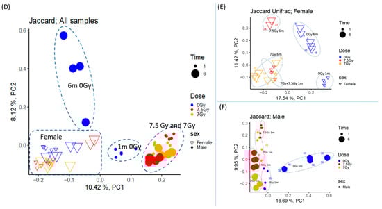 To understand the effects of sex, we re-plotted the male and female samples separately. Figure 2E displays the PCoA plot associated with females, where PC1 and PC2 explained 11.4% and 17.5% of the total variance, respectively. The samples were clustered in five groups; 7 Gy-1 m and 7.5 Gy-1 m are clustered together, and the rest of the samples, namely 0 Gy-1 m, 0 Gy-6 m, 7 Gy-6 m, and 7.5 Gy-6 m, are clustered separately. Radiation dose and its cumulative effects with time (RD × TSI) emerged as the primary factors explaining the beta diversity in females. This trend was nearly mirrored in the PCoA plot of the beta diversity in males (Figure 2F). Here, PC1 and PC2 explained 16.7% and 9.9% of the total variance, respectively, and the samples were clustered in six groups: for males, the 7 Gy-1 m and 7.5 Gy-1 m are separately clustered. RD and TSI both emerged as the driving forces to explain the beta diversity in the male population. Figure S1A–C presented a PCoA plot generated by a weighted Unifrac algorithm, and its clustering pattern was similar to the Jaccard algorithm (Figure 2D–F).