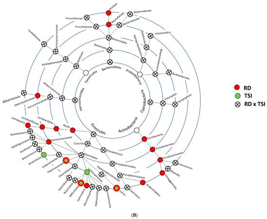 Cladograms showing the most perturbed bacterial taxa up until species level. The bacterial taxa, which were perturbed by RD and TSI, are presented here. The figure legends are on the left side of the plots. (A) Female- and (B) male-specific bacterial taxa that were significantly perturbed by RD and/or TSI.