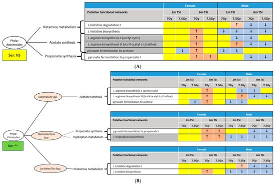 All these abovementioned networks were classified under the following super families: metabolism of amino acids, carbohydrates, lipids, and xenobiotics, synthesis of SCFA and neurotransmitters, regulation of bioenergy, immune functions, and homeostasis of purine and pyrimidine compounds. Table 3 lists those microbiome-related networks that were differentially regulated by the cumulative factor (Sex × RD × TSI) in at least one of the four conditions, namely 7 Gy-1 m, 7 Gy-6 m, 7.5 Gy-1 m, and 7.5 Gy-6 m. Based on the currently available literature [,,,,,,,], Figure 4 integrates the functional networks with the major abundant phyla, Bacteroidetes (Figure 4A) and Firmicutes (Figure 4B). An overall low-abundant phylum, Actinobacteria, was differentially enriched between male and female mice; integrative functional analysis indicated that Actinobacteria is associated with lactate synthesis, which was largely inhibited in the male cohorts (Figure S4). Indeed, the study of the longitudinal regulation of biofunctions suggested a sex bias. For instance, in the male mice, the networks linked to acetate biosynthesis by Bacteroidetes and Firmicutes were mostly inhibited 6 m post-TBI.