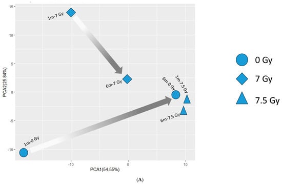 Male- and female-specific PCA plots (Figure 5A,B) reveal a similar pattern. The female-specific PCA of the metabolite regulation profile found that the baseline mice (0 Gy) and mice irradiated at 7 Gy were separated by a time difference (1 m → 6 m) across PC1 (54.5%); the temporal separation (1 m → 6 m) at 7.5 Gy TBI was minimum. In males, the temporal separations (1 m → 6 m) were observed in all radiation doses, namely 0 Gy or baseline, 7 Gy, and 7.5 Gy (Figure 4B).
