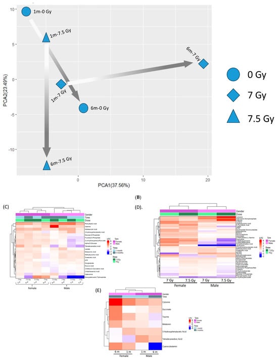 Fecal metabolite profile. Figure (A,B): Principal Component Analysis (PCA) plots show the distribution of the metabolite profile. The legends are on the right-hand side. The arrows trace the temporal shifts (1 m to 6 m) of those samples that were exposed to the same radiation doses. (A) Female- and (B) male-specific metabolite profile. Figure (C–E): Hierarchical clustering plots using the Euclidian algorithm show the differentially expressed metabolites (DEMs) identified by ANOVA. The legends are on the right-hand side. (C) Metabolites differentially expressed by Sex × RD × TSI. (D) Metabolites differentially expressed by Sex × RD. (E) Metabolites differentially expressed by Sex × TSI.
