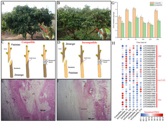 Performance in the field, an anatomical analysis, and a gene expression analysis related to compatible and incompatible litchi grafting. (A,B) The performance of grafted litchi trees in the field. The pictures were taken 30 days post-grafting. (C,D) An illustration of compatible and incompatible litchi grafting. For compatible litchi grafting, cultivar FZX was used as the ‘scion’ and ZNX as the ‘rootstock’ with the opposite for incompatible grafting. Red arrow indicating the graft union. (E) An anatomical analysis of the compatible and (F) incompatible litchi grafts. The bar size indicates 100 μm. The anatomical analysis was performed 30 days post-grafting. (G) Total endogenous indole acetic acid (IAA) contents from compatible and incompatible litchi grafts. Error bars indicate the standard error of the mean (SEM) of three biological replicates. Distinct lowercase letters signify a statistically significant difference at the p-value 0.05 level. The analysis was performed 2 h and 3, 7, 14, 21, and 30 days post-grafting. Lowercase letters denote statistically significant differences between three biological replicates. (H) A heatmap highlighting the expression analysis of the ABC transporter, Aux/LAX, and PIN genes in the compatible and incompatible litchi grafts. The expression was observed at 7, 14, and 21 days post-grafting in compatible and incompatible litchi grafts.