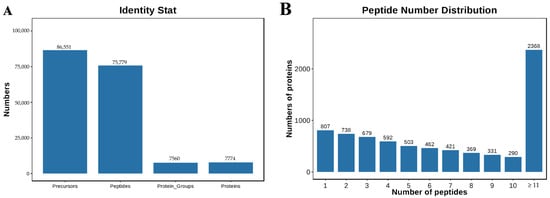 Data-independent acquisition (DIA) mass spectrometry analysis of placental samples from different ovine gestational stages identified 86,551 precursors, 75,779 peptides, 7560 protein groups, and 7774 proteins (Figure 1A). Peptide distribution analysis demonstrated that 2368 proteins were identified with ≥11 peptides, 807 proteins with a single peptide, and the remaining proteins with 2–10 peptides (Figure 1B), confirming high data coverage and reliability for subsequent differential expression analysis.