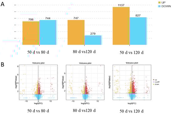 Comparative analysis revealed significant temporal changes in protein abundance. Between 50 d and 80 d of gestation, 706 proteins were significantly upregulated and 744 were downregulated. From 80 d to 120 d, 747 proteins exhibited upregulation compared to 279 downregulated proteins. Notably, comparing early (50 d) and late (120 d) gestation identified 1137 upregulated and 827 downregulated proteins (Figure 2), highlighting dynamic proteomic remodeling throughout pregnancy. The complete list of differential proteins is presented in the Supplementary Excel file.