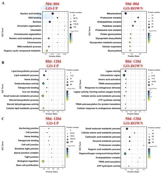 GO analysis of upregulated proteins during the 50–80 d gestational period revealed enrichment in biological functions related to nucleic acid binding, transcription/translation, and organic metabolism, while downregulated proteins were predominantly associated with mitochondrial activity, cellular respiration, glycosylation, and protease synthesis/metabolism (Figure 3). In the 80–120 d comparison, upregulated proteins showed functional enrichment in lipid metabolism, small molecule metabolism, iron ion binding, and steroid synthesis, whereas downregulated proteins were linked to amino acid metabolism, ligase activity, response to endogenous stimuli, and tRNA aminoacylation. Notably, the 50–120 d gestational comparison demonstrated upregulated protein enrichment in cell junction organization, biological regulation, and stem cell proliferation, contrasting with downregulated proteins enriched in small molecule metabolism, amino acid metabolism, protease synthesis, tRNA aminoacylation, and ATP catabolic activity.
