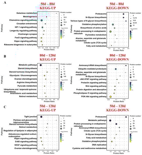 KEGG pathway analysis (Figure 4) revealed distinct functional patterns across gestational stages. During the 50–80 d period, upregulated proteins in placental cotyledons were primarily enriched in nutrient metabolism-related pathways such as carbohydrate metabolism, steroid hormone synthesis, and amino acid metabolism, whereas downregulated proteins were associated with amino acid metabolism, N-glycan biosynthesis, TCA cycle, and fatty acid metabolism. In the 80–120 d comparison, upregulated proteins again showed enrichment in carbohydrate metabolism, steroid hormone synthesis, and amino acid metabolism, while downregulated proteins were linked to amino acid metabolism, N-glycan biosynthesis, JAK-STAT signaling, Wnt signaling, prolactin signaling, and protein metabolic pathways. Analysis of the full gestational span (50–120 d) demonstrated upregulated protein enrichment in tight junction formation, carbohydrate/lipid/amino acid metabolism, and proliferation-related pathways (Hippo/YAP, ErbB, VEGF), contrasting with downregulated proteins involved in amino acid metabolism, N-glycan biosynthesis, TCA cycle, and fatty acid metabolism.