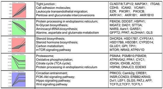 To characterize expression patterns of differentially abundant proteins (DEPs) across three placental developmental phases, we performed k-means clustering of all placental DEPs, partitioning them into five distinct clusters (Figure 5). These clusters exhibited stage-specific expression trajectories and distinct biological functional enrichments. Cluster1 DEPs demonstrated progressive upregulation across developmental stages, with significant enrichment in tight junction assembly, immune responses, and carbohydrate metabolism. In contrast, Cluster2 proteins showed gradual downregulation throughout gestation, enriched in endoplasmic reticulum protein processing, N-glycan biosynthesis, and metabolic pathways. Cluster3 exhibited marked upregulation specifically during the 80–120 d phase (non-significant at 50–80 d), with functional enrichment in steroid biosynthesis and mTOR signaling pathways. Cluster4 proteins were significantly downregulated during 50–80 d (non-significant thereafter), primarily associated with proteasome function, energy metabolism, and endoplasmic reticulum protein processing. Cluster5 demonstrated significant upregulation at 50–80 d (non-significant in later stages), enriched in necroptosis regulation, PI3K-Akt signaling, and Hippo pathway activation.