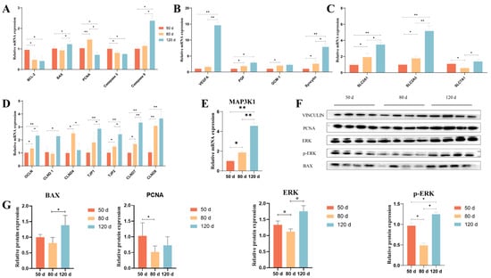 mRNA and MAPK pathway protein expression levels of placental differential function in sheep at different gestational stages. (A): The mRNA expression levels of genes related to cell proliferation and apoptosis. (B): The mRNA expression levels of genes related to the functions of placental trophoblast cells. (C): The mRNA expression levels of genes related to nutrient transport. (D): The mRNA expression levels of genes related to tight junction proteins. (E): The mRNA expression level of MAP3K1. (F): Western blot analysis of PCNA, BAX, ERK and P-ERK in ovine placenta across gestational stages. (G): Quantitation of the western blot results of Figure 7F. “*” or “**” indicates a statistically significant difference at the p < 0.05 or p < 0.01 level among 50 d, 80 d, and 120 d groups, respectively.