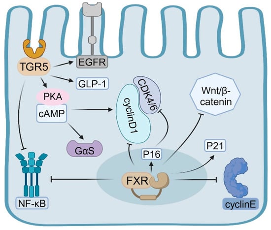 FXR modulates the proliferation of intestinal epithelial cells through direct influence on the expression of genes associated with the cell cycle [32,33]. Specifically, FXR upregulates cell cycle inhibitors, notably increasing the expression of p21 (CDKN1A) [33,34], which subsequently inhibits epithelial cell proliferation. Empirical evidence indicated that FXR can directly bind to the FXR response element (FXRE) within the promoter region of the p21 gene, thereby enhancing its transcription [35]. Additionally, in certain cell types, FXR is capable of upregulating the expression of p16 (CDKN2A) [36]. The protein p16 functions by inhibiting CDK4/6 activity, thus preventing the transition of cells from the G1 phase to the S phase, effectively regulating cell proliferation [37]. Moreover, FXR activation triggers a pro-apoptotic program in both differentiated normal colon epithelium and transformed colonocytes [33].